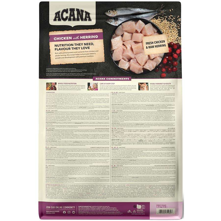 Tüm hayvansal malzemelerle dolu bir mamayla yavru kedinizin hayatına hızlı bir başlangıç yapın. Yavru kedinizin en üst düzeyde büyüme ve gelişme için ihtiyaç duyduğu her şeyi sağlamak üzere hazırlanmış olan ACANA First Feast, WholePrey oranlarında et, organ, kıkırdak ve kemikten oluşan serbest dolaşan tavuk ve bütün ringa balığı ile doludur ve yavru kedinizin büyümesi için ihtiyaç duyduğu her şeyi sağlar.