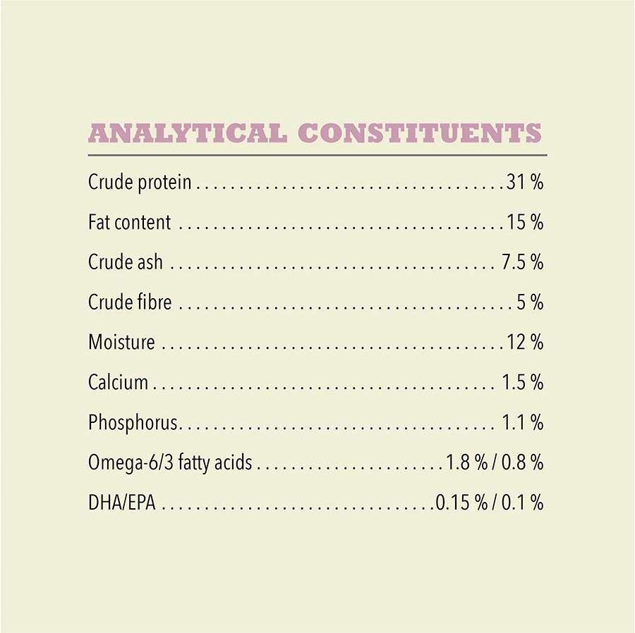 İÇİNDEKİLER : Çiğ otla beslenmiş kuzu (%18), kuzu eti unu (%18), bütün yeşil bezelye, bütün kırmızı mercimek, çiğ kuzu ciğeri (%4), kuzu yağı (%4), taze elma (%4), bütün garbanzo fasulye, bütün yeşil mercimek, bütün sarı bezelye, çiğ kuzu işkembe (%2), çiğ kuzu böbreği (%2), kurutulmuş kuzu kıkırdağı (%2), mercimek lifi, deniz yosunu (%1.2) (saf ve sürdürülebilir DHA kaynağı) ve EPA), taze bütün balkabağı, taze bütün balkabağı, kurutulmuş kahverengi yosun, tuz, dondurularak kurutulmuş kuzu ciğeri (%0,1), taze bütün kızılcık, taze bütün yaban mersini, hindiba kökü, zerdeçal kökü, deve dikeni, dulavratotu kökü, lavanta , hatmi kökü, kuşburnu. KATKI MADDELERİ (kg başına): Teknolojik katkı maddeleri: doğal kaynaklı tokoferol açısından zengin öz. Besin katkı maddeleri: D vitamini: 500IU, E vitamini: 100IU, çinko proteinat: 160mg, kalsiyum pantotenat: 12.5 mg, amino asitlerin bakır şelatı hidrat: 11mg.