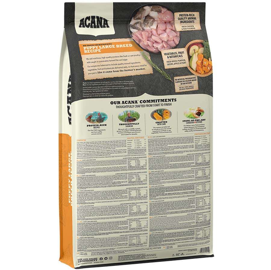Büyük cins köpek yavrusu, hızlı büyümesini ve kemik gelişimini desteklemek için, tüm hayvansal içeriklerden daha fazla protein ve yağ dahil olmak üzere benzersiz beslenme gereksinimlerine sahiptir. ACANA Puppy Large Breed, büyüyen yavru köpeğinize her şeyi veren bir diyet için, WholePrey et, organ, kıkırdak ve kemik oranlarında serbest dolaşan tavuk ve vahşi yakalanmış pisi balığı ile ve lezzetli kafessiz yumurtaların ilave beslenmesiyle doludur. sağlıklı, mutlu ve güçlü büyümeleri gerekiyor.