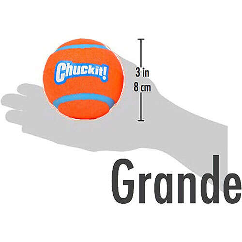 Chuckit tenis topları doğal ve ekstra dayanıklı kauçuktan üretilmiştir ve suda batmaz.Chuckit fırlatıcılar ile uyumludur ve parlak rengi ile at getir oyunları sırasında gözden kaybolmaz.7.5cm çapı ile orta ve büyük ırk köpekler için uygundur.Bir pakette iki adet Chuckit büyük boy tenis topu bulunur.