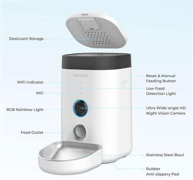 App Besleme Planı Günde 20 öğün, öğün başına maksimum 39 porsiyon Güç Kaynağı USB adaptör ve 3 × D pil yedeklemesi