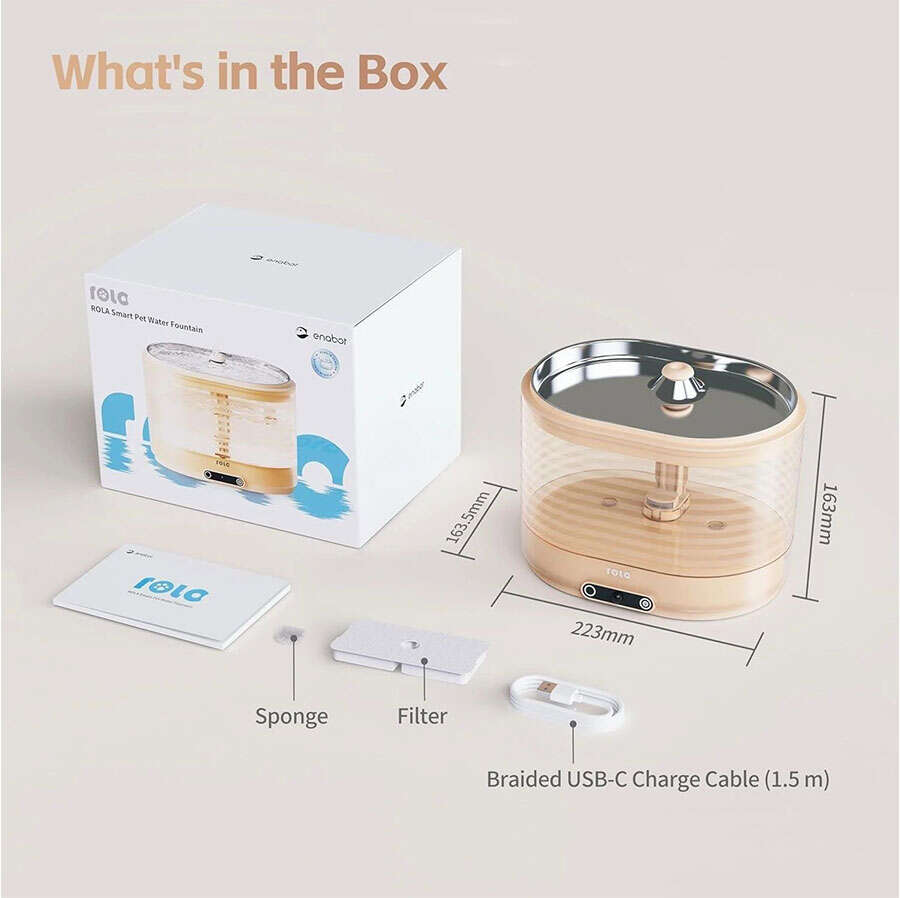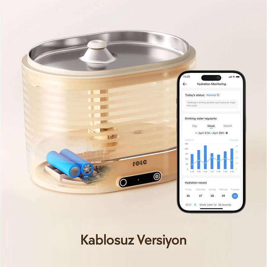 2L Bağlantı: Kablolu/Kablosuz Ölçüleri: 22 x 16 x 16.3 cm Malzeme: ABS, Paslanmaz Çelik, Silikon Ses: Ultra sessiz. Evcil hayvanınızı uykusunda rahatsız etmez. Filtreleme: 3 Katmanlı filtreleme mevcut. Akıllı Bağlantı: Rola Mini ile bağlanır.