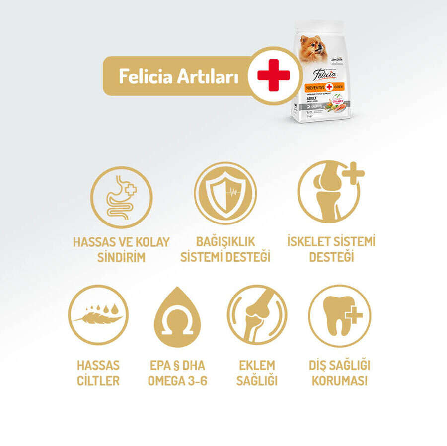 Felicia® olarak, küçük ırk dostlarımızın benzersiz sağlık ihtiyaçlarınaözel, koruyucu ve bütünsel bir yaklaşım sunuyoruz. Felicia® Preventive Care AdultSalmon Small, kolajen desteği ve özenle seçilmiş süper besinlerlezenginleştirilmiş yeni nesil formülüyle, sağlıklı eklemlerden göz alıcıparlak tüylere, güçlü bağışıklıktan optimize edilmiş sindirim desteğine kadarkapsamlı bir bakım sunar. Norveç somonundan gelen yüksek kaliteli protein vedoğal Omega 3 yağ asitleri, sadece mükemmel bir lezzet deneyimi sağlamaklakalmaz, aynı zamanda beyin ve görme fonksiyonlarının aktif olarak desteklenmesiiçin ideal bir besinsel temel oluşturur.
