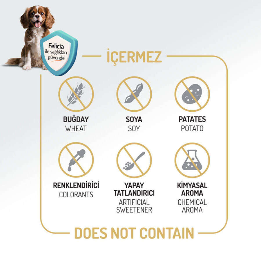 Felicia® olarak, küçükırk köpeklerin narin bünyelerine uygun, az tahıllı ve hipoalerjenik birformül sunuyoruz. Mamalarımız; sığır eti, süt ürünleri, buğday, soya,patates, yapay tatlandırıcı, renklendirici, kimyasal aroma ve GDO içermez.