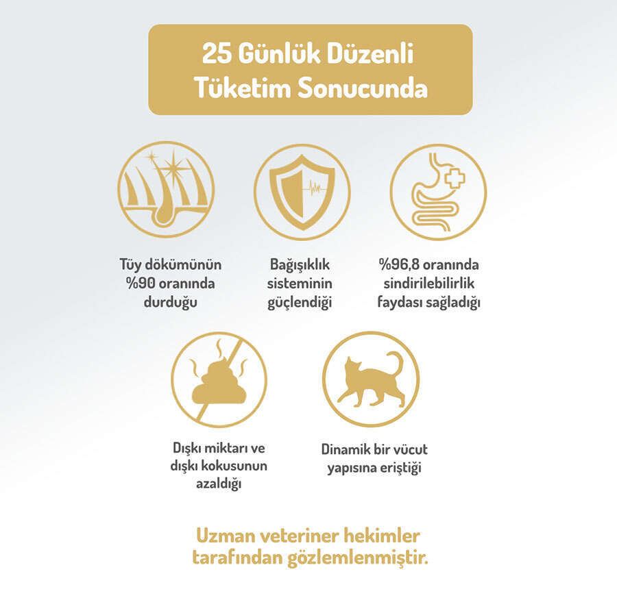 İdeal Kilo & Sağlıklı Vücut Kondisyonu: İçeriğindeki L-Carnitine, Vitamin A ve yüksek kaliteli hayvansal proteinler ile kedinizin ideal kilosunun korunması için organizmada yağın enerjiye dönüşümünü kolaylaştırır ve kas hücrelerinin sağlıklı oluşumuna yardımcı olur.