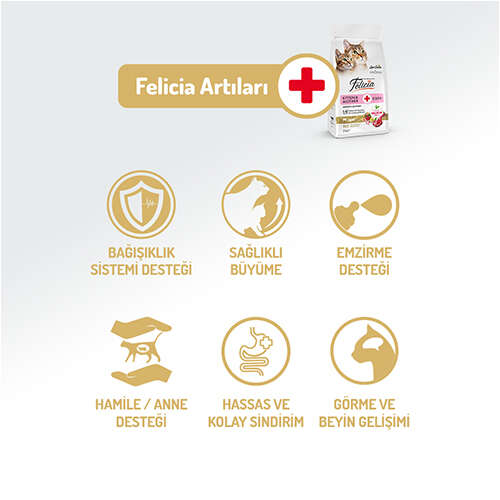 Yaşamımız boyunca, duygusal bağ kurduğumuz birçok an vardır. Bazen yeni bir birey, bazen ise bir anne ya da operasyondan çıkan bir can ile yollarımız kesişir. Felicia Kitten&Mother ile sevimli dostlarımıza, tüm yaşam evrelerinde destek olmak için özel bir formülasyon hazırladık. Beslenmenin en temel yapı taşlarını barındıran bu formül, onların sağlığını ve mutlu gelişimini desteklemek için özel olarak geliştirildi. Protein oranı yüksek, beyin ve görme gelişimi için DHA içeren, anne sütünde bulunan temel besin maddelerini içerisinde barındıran ve güçlü bağışıklık desteği sunarak hayat standartlarını yükselten bu formül ile beklentilerinizi en iyi şekilde karşılamaya hazırız. Felicia Kitten&Mother yalnızca en kaliteli doğal bileşenleri içerir. Gerçek kuzu etinden gelen yüksek protein, güçlü ve sağlıklı kas yapısı oluşumunu destekler ve içeriğinde genetiği değiştirilmiş (GDO) ürünler bulunmaz.