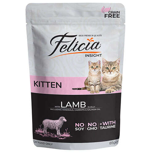 Felicia Tahılsız 85 gr Yavru Kediler için Kuzulu Yaş Kedi Maması, veteriner hekimler ve beslenme uzmanları tarafından özel olarak formüle edilmiştir. Dostlarımızın vazgeçilmez yaşam kaynağı olan Taurin desteği, GDO, soya ve tahıl içermeyen özel formülü ile benzersiz bir tüketim deneyimine hazır olun.