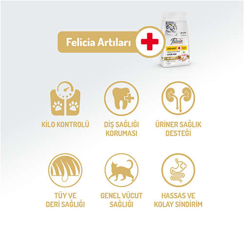 Sevimli dostlarımızın doğal yaşam şartlarına uygun şekilde beslenip, daha sağlıklı yaşayabilmeleri için beslenme uzmanlarımızla birlikte, tahıl oranı düşürülmüş hypoallergenic özel bir formül hazırladık. Yüksek oranda sindirilebilir hayvansal protein kaynaklarına sahip Felicia, sindirim ve alerji hassasiyetlerine karşı özel olarak geliştirilmiştir. Alerjik reasksiyonlarla ilişkili olan sığır eti, süt ürünleri, buğday, soya, patates, yapay tatlandırıcı, renklendirici, kimyasal aroma ve GDO içermemektedir!