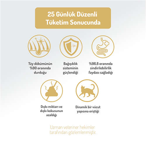 İÇİNDEKİLER: Kurutulmuş Tavuk Proteini (%35), Baldo Pirinç, Mısır, Rafine Tavuk Yağı, Bezelye, Hamsi Unu, Karides Unu, Bira Mayası, Hidrolize Tavuk Ciğeri, Hamsi Yağı, Nükleotit Maya Proteini, Mineraller, Prebiotik Mannan Oligo Sakkaritler, Deniz Yosunu, Avizeağacı Özütü, Kızılcık Tozu, Pisilyum.