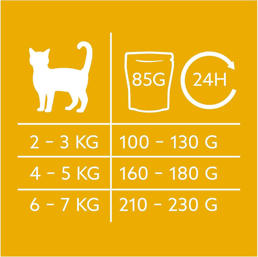 Beslenme talimatı: 2-3 kg kediler için günlük 130 gr, 4-5 kg kediler için 180 gr, 6-7 kg kediler için ise 230 gr mama verilmesi tavsiye edilir.