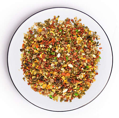 Bitkisel press pellet (Yonca, Maydanoz yaprağı, Geyik Boynuzu, Karahindiba, Havuç, Elma, Yabani Havuç, Sarı papatya, Çilek yaprağı), Mısır, Mısır patlağı, Buğday, Yulaf, Çavdar, Aspir, Çizgili çekirdek, Beyaz çekirdek, Kabak çekirdeği, Keçiboynuzu, Havuç, Bezelye, Kurutulmuş brokoli, Fıstık, Pastacılık ürünleri