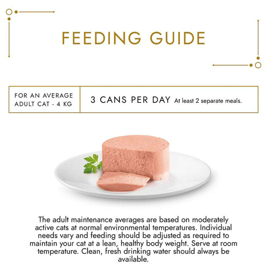 4 kg vücut ağırlığına kadar olan yetişkin kediler için, iki ayrı öğün olarak günde 3 - 4 kutu ile beslenmesi tavsiye edilmektedir.