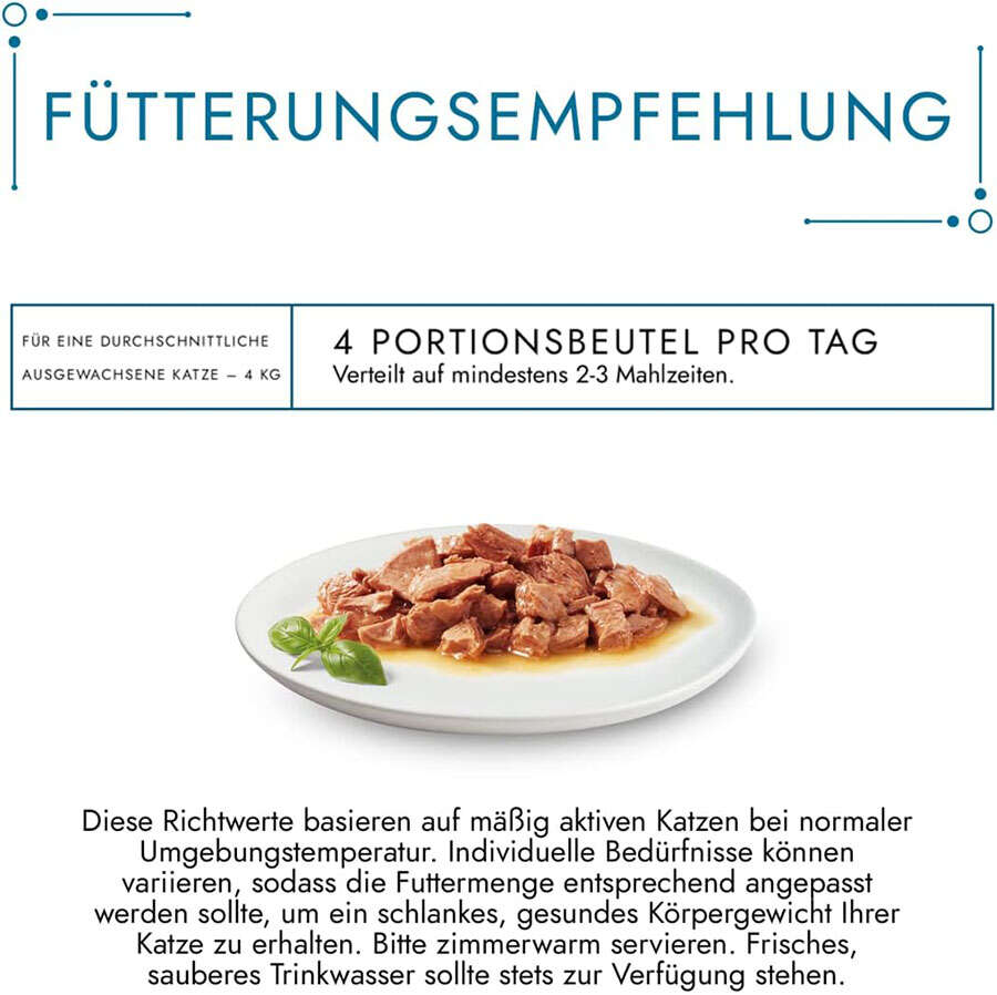 4 kg vücut ağırlığına kadar olan yetişkin kediler için, iki ayrı öğün olarak günde 3 - 4 kutu ile beslenmesi tavsiye edilmektedir.