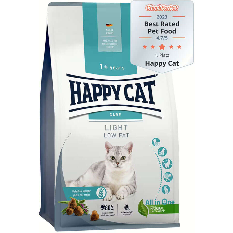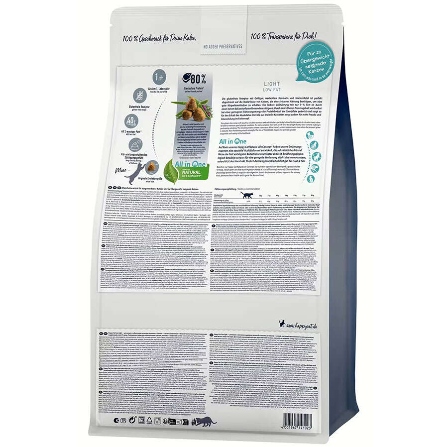 Happy Cat Sensitive Light'ın değerli biberiye ve deve dikeni içeren lezzetli formülü, aşırı kilolu kediler ve fiziksel yapısını korumak için özel olarak geliştirilmiştir. Tatmin edici, yüksek lifli gıda sadece %9 yağ içerir. Kolay sindirilebilir kümes hayvanları ve ince otların kombinasyonu, üç farklı mama tanesi sayesinde daha fazla yemek yeme zevki ve daha fazla çeşitlilik sağlar.Sağlıklı, parlak bir tüy için aktif cilt bakımı besinleri içerir.