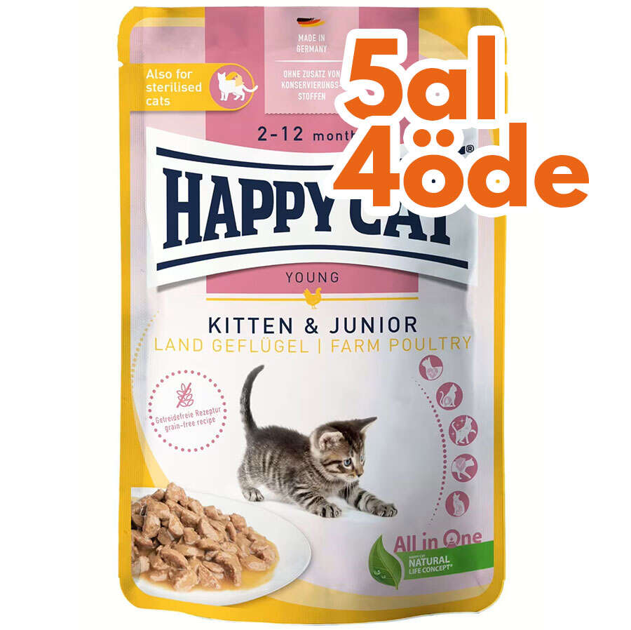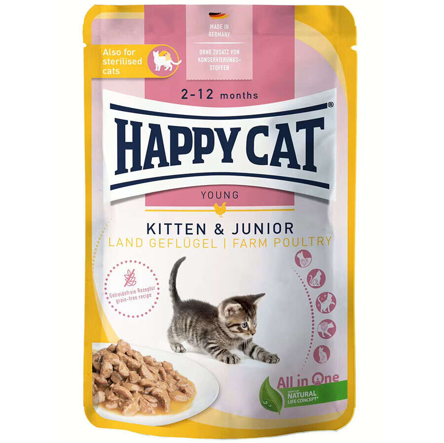 Happy Cat Meat in Sauce Kitten & Junior Farm Poultry yüksek kaliteli et ile özenle hazırlanmıştır. Kümes hayvanları ve lezzetli sos içeren tahılsız ve kolay sindirilebilir tarif, küçük yavru kedilerin ihtiyaçlarına göre tam olarak uyarlanmıştır. Lezzetli tam mama, yavru kedinin uyumlu büyümesi için ihtiyaç duyduğu her şeyi içerir ve ayrıca vücudun kendi savunmasını destekler.