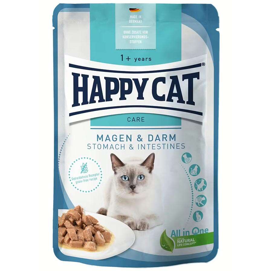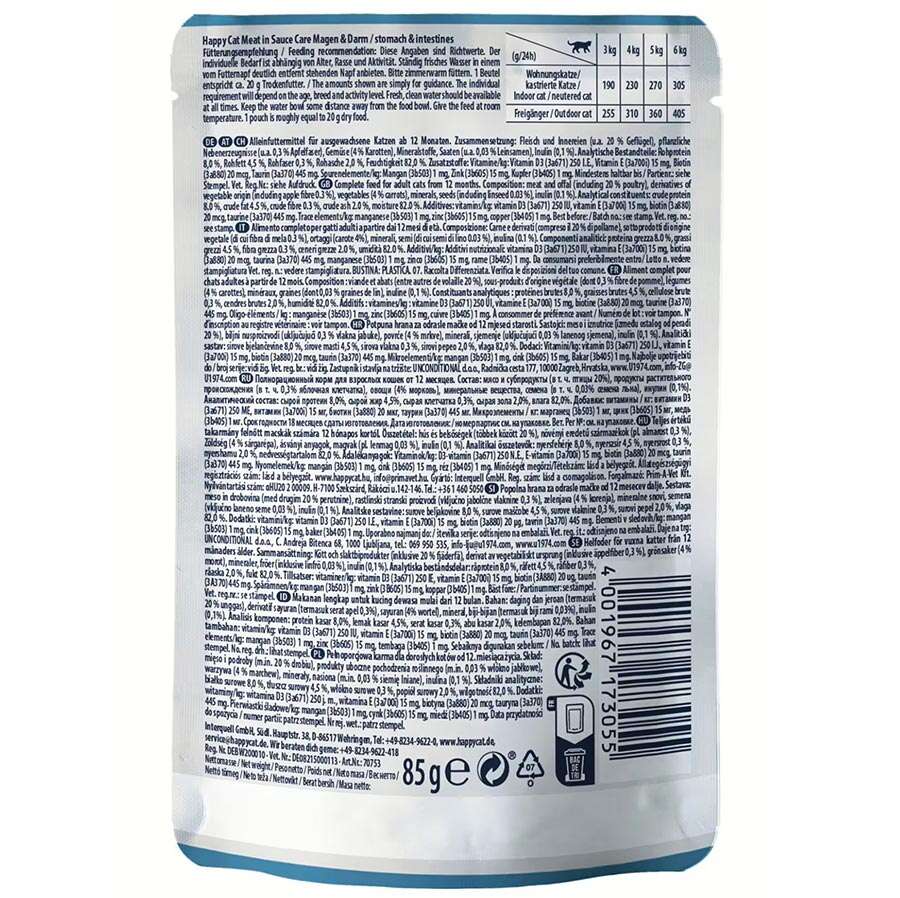 Happy Cat Meat inSauce Stomach & Intenstines kolayca sindirilebilir ve hassas sindirime sahipkediler için özel olarak geliştirilmiştir. Nefis bir sos içindeki lezzetli vetahılsız et parçaları, kedi dostunuzu sindirim sistemi üzerindeki stresi azaltacak ve sindirimirahatlatacaktır.