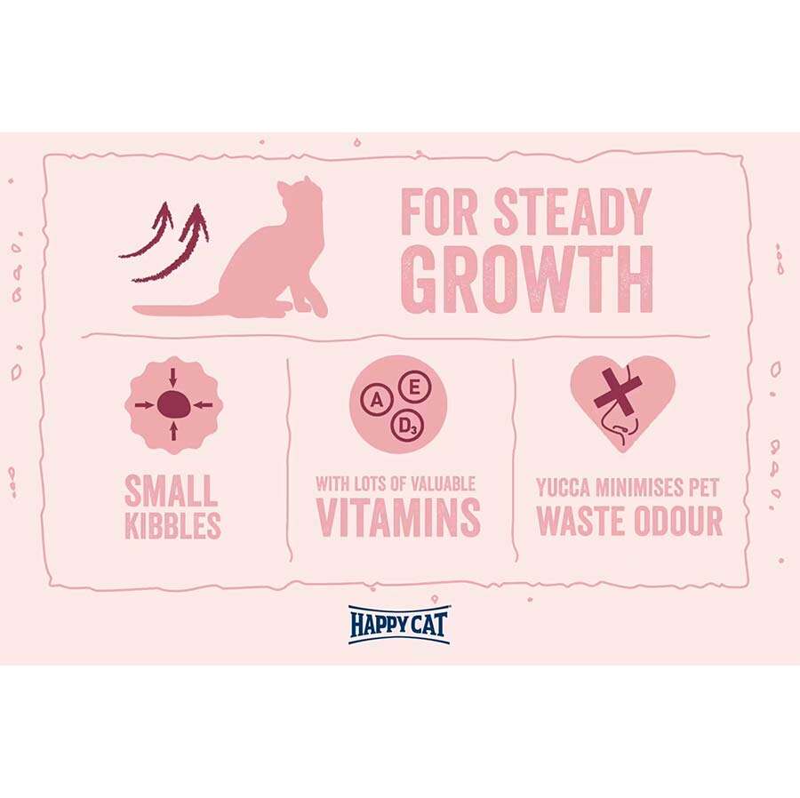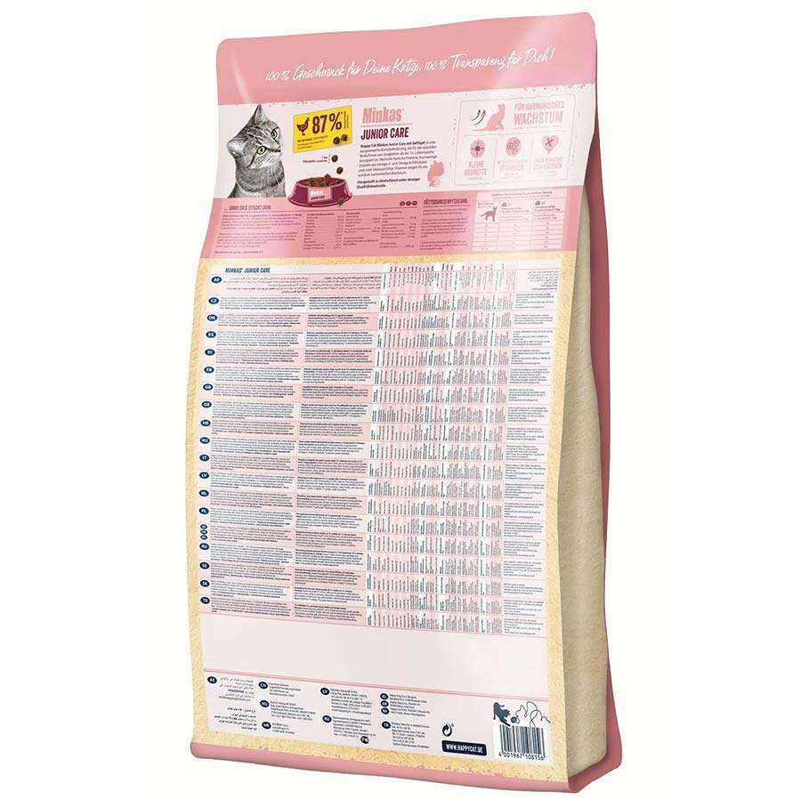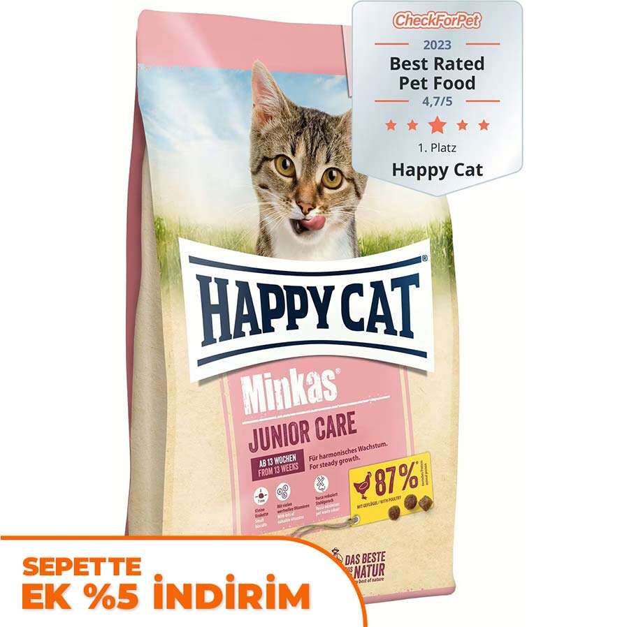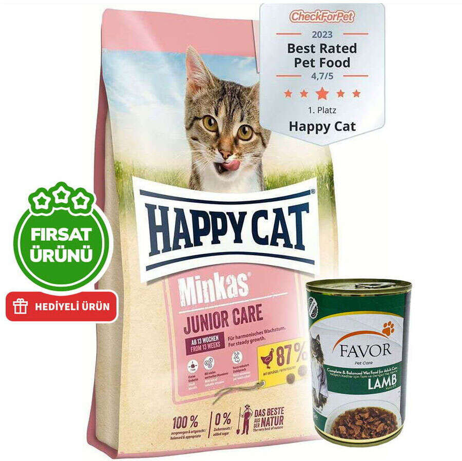 Happy Cat Minkas Junior Care mamamız, Omega-3 ve Omega-6 yağasitleri gibi değerli proteinler ve yüksek kaliteli içerikler içerir. Lezzetlikümes hayvanları içeren dengeli formülü, genç kedilerin ihtiyaçlarınıkarşılamak üzere özel olarak tasarlanmıştır. Bu tam mama, 13. haftadan itibarenkediler için idealdir ve kedinize uyumlu bir büyüme için ihtiyaç duyduğu herşeyi sağlar. Yüksek oranda yüksek değerli hayvansal protein içeren tarifimiz%100 doğal ve dengelidir. Bu lezzetli kuru mama, birçok vitamin ve mineraliçerir ve bağışıklık sistemini destekler. Tariflerimiz doğal olarak yapay aromavericiler ve koruyucu maddeler içermez.