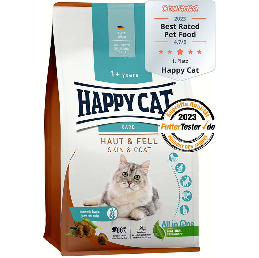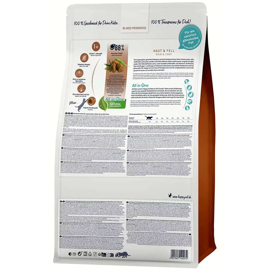 Kolayca sindirilebilir tavuk, besin açısından zengin keten tohumu ve ayçiçeği ve kolza yağı içeren bu dengeli tarifle kedinizin tüylerinin bakımına yardımcı olun. Aktif cilt bakımı besinleri - biotin, çinko ve Omega-3 ve Omega-6 yağ asitleri - sağlıklı bir cilt ve parlak bir tüy oluşumunu destekler. Happy Cat Sensitive Skin & Coat, hassas cilde sahip kediler için özel olarak geliştirilmiştir.