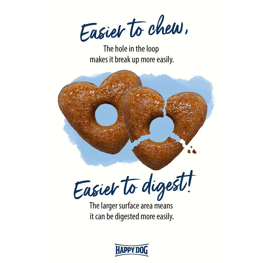 Yavru mamamız için olan mama tanesi kalp şeklindedir ve ortasında bir delik vardır. Bu, yavru köpeğinizin parçaları daha hızlı kırmasını sağlayarak çiğnemeyi kolaylaştırır. Daha geniş yüzey alanı, yiyeceğin mide suları tarafından en uygun şekilde parçalanması anlamına gelir ve bu da iyi sindirimi destekler.