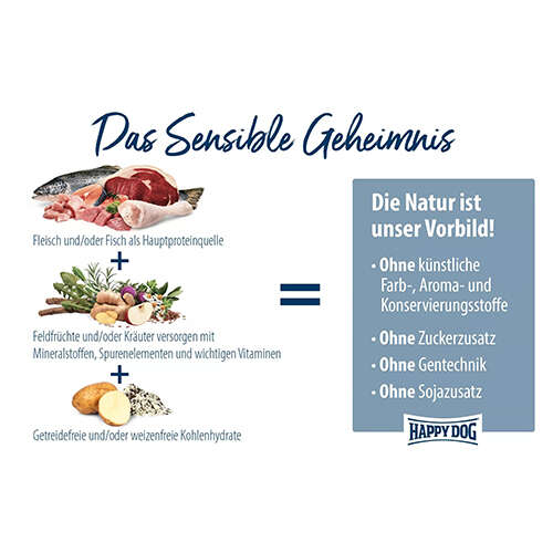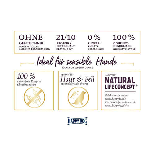 Eşsiz Happy Dog Natural Life Concept®'e dayanan Yeni Zelanda midyeleri eklemleri destekler ve değerli Omega-3 ve Omega-6 yağ asitleri sağlıklı bir cilt ve parlak bir tüy olmasını sağlar.