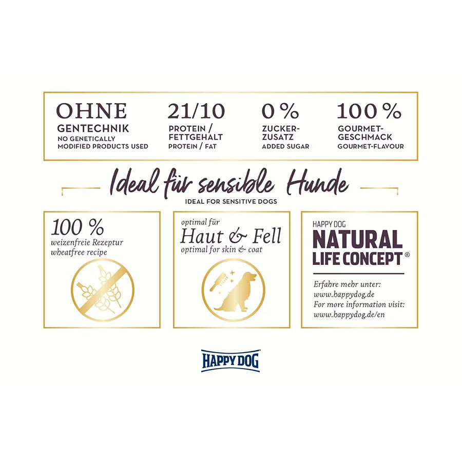 Eşsiz Happy Dog Natural Life Concept®'e dayanan Yeni Zelanda midyeleri eklemleri destekler ve değerli Omega-3 ve Omega-6 yağ asitleri sağlıklı bir cilt ve parlak bir tüy olmasını sağlar. Happy Dog Ireland'ın lezzetli formülasyonu, 11 kg'dan itibaren seçici iştahlı yetişkin dört ayaklı arkadaşlar için idealdir