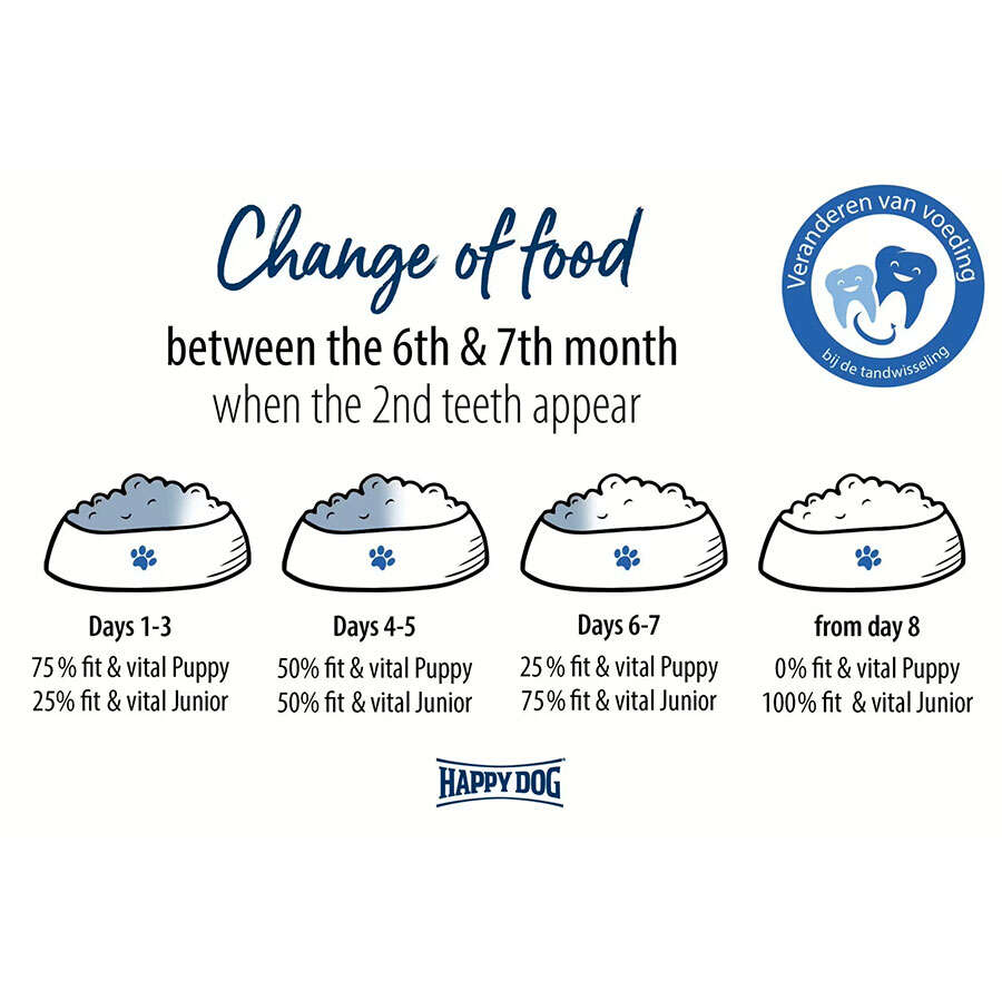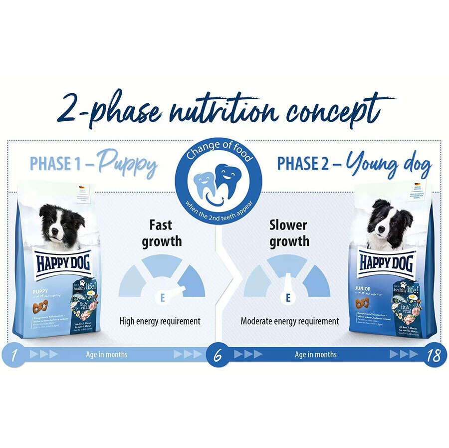Sadık arkadaşınız özellikle yaklaşık 6 aya kadar hızlı büyür. Bunu, orta derecede büyüdüğü genç köpek evresi takip eder. Bu noktada, fit & vital Junior gibi bu aşamaya uygun bir köpek mamasına geçmelisiniz . Eski mamayla karıştırdığınız yeni mamanın oranını kademeli olarak artırarak köpeğinizi yeni mamaya yavaş yavaş alıştırın. Bu, köpeğinizin gastrointestinal sisteminin değişime uyum sağlamasına izin verecektir.