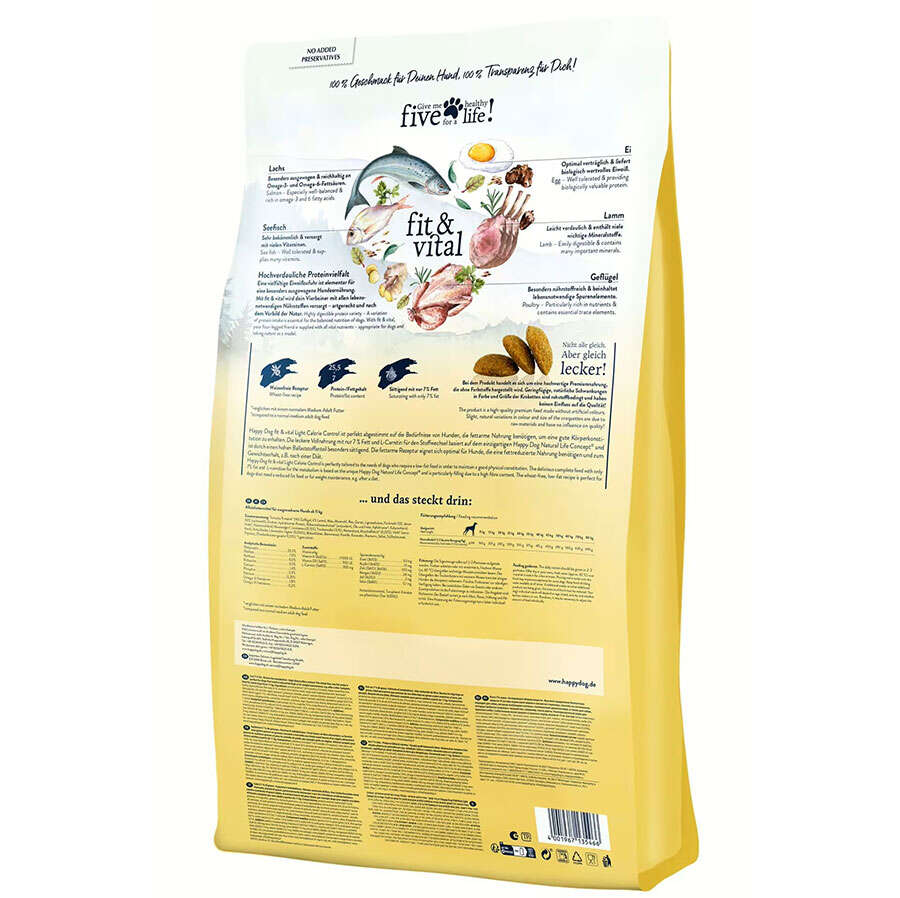 Happy Dog fit & vital Light Calorie Control, vücut yapılarını korumak veya örneğin belirli bir diyeti uygularken belirli bir vücut ağırlığını korumak için az yağlı bir diyete ihtiyaç duyan köpeklerin ihtiyaçlarına mükemmel şekilde uyarlanmıştır. Sadece %7 yağ ve L-Karnitin içeren lezzetli, buğday içermeyen hepsi bir arada mama, sağlıklı bir metabolizmayı destekler ve benzersiz Happy Dog Natural Life Concept®'e dayanır . Yüksek lif içeriği nedeniyle bu kuru mama özellikle doyurucudur.