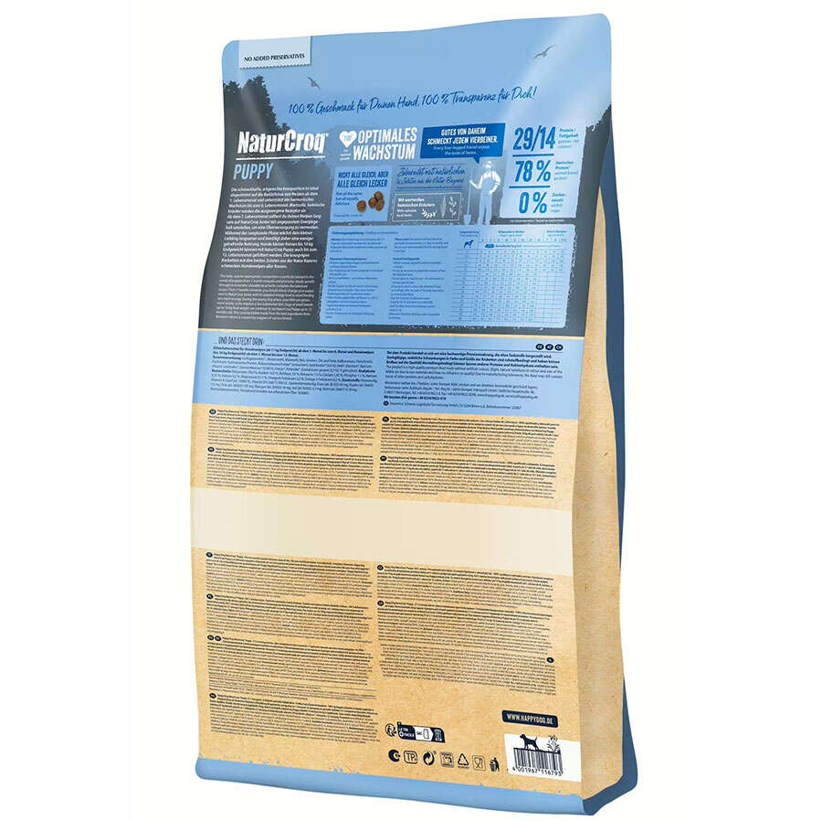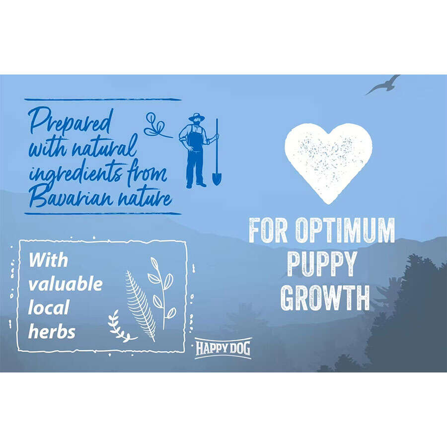 Happy Dog NaturCroq Puppy'nin optimal yağ ve protein içeriği, yüksek büyümenin ilk aylarında yavrulara mükemmel destek sağlar ve sağlıklı, uyumlu gelişim sağlar. Yüksek değerli hayvansal protein, yerel olarak yetiştirilen tam tahıllar ve temel vitaminler, eser elementler ve mineraller içeren dengeli bir diyet, yavru köpeğinizin optimum gelişimini garanti etmek için hayati önem taşır. Kalsiyum ve D3 vitamini, vücut gücü ve sağlıklı kemiklerin gelişmesinde büyük rol oynar. Değerli doymamış yağ asitleri, yavru köpeğinizin sağlıklı bir cilt bariyeri ve parlak bir tüy geliştirmesini sağlar. Bu son derece lezzetli formülasyon, dört ayaklı arkadaşınıza doğal bir kaynaktan birçok önemli besin sağlayan, yerel olarak yetiştirilen değerli otlar içerir.