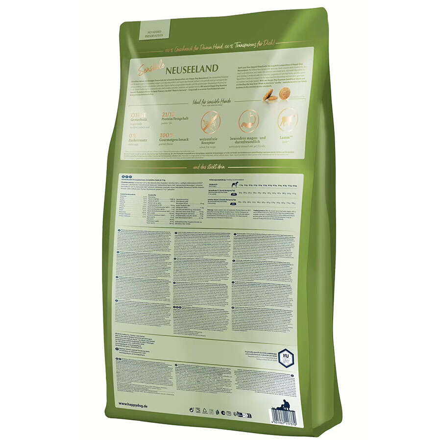 Olağanüstü lezzetli Super Premium Complete Food Happy Dog New Zealand, çeşitliliğe ihtiyaç duyan veya hassas sindirime sahip 11 kg'a kadar olan titiz yetişkin gurme köpekler için idealdir.
