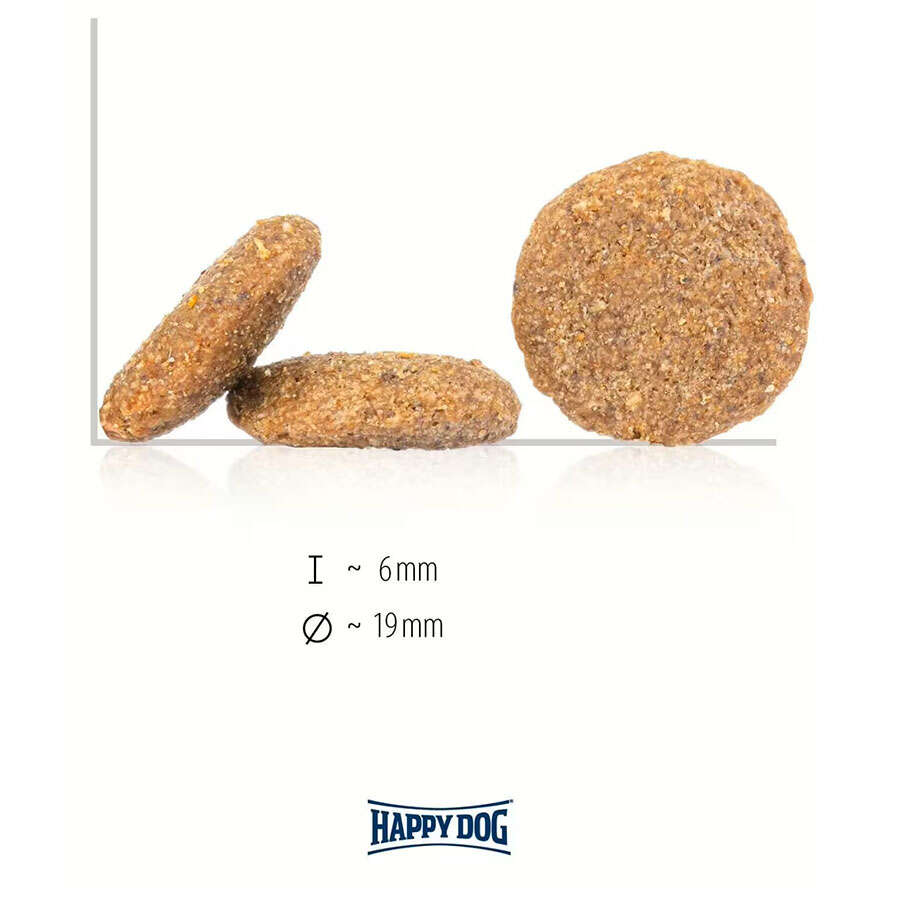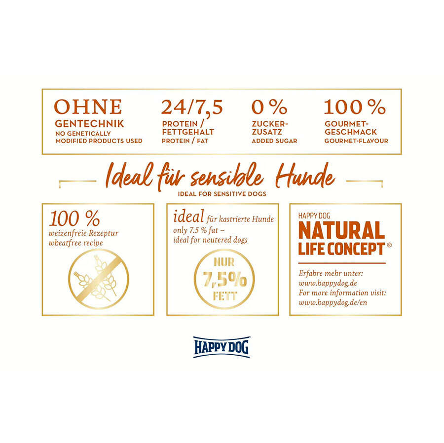%7,5'lik orta derecede yağ içeriği nedeniyle Happy Dog Toscana, kısırlaştırılmış köpekler ve az yağlı diyete ihtiyaç duyan köpekler için de idealdir.