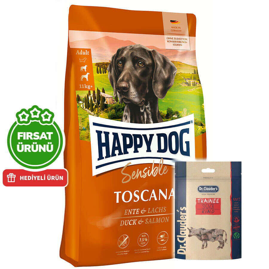 Happy Dog Toscana ile ince ördek, az yağlı deniz balığı ve Akdeniz bitkilerinden oluşan dengeli bir kompozisyonla küöpeğinizi şımartırsınız.