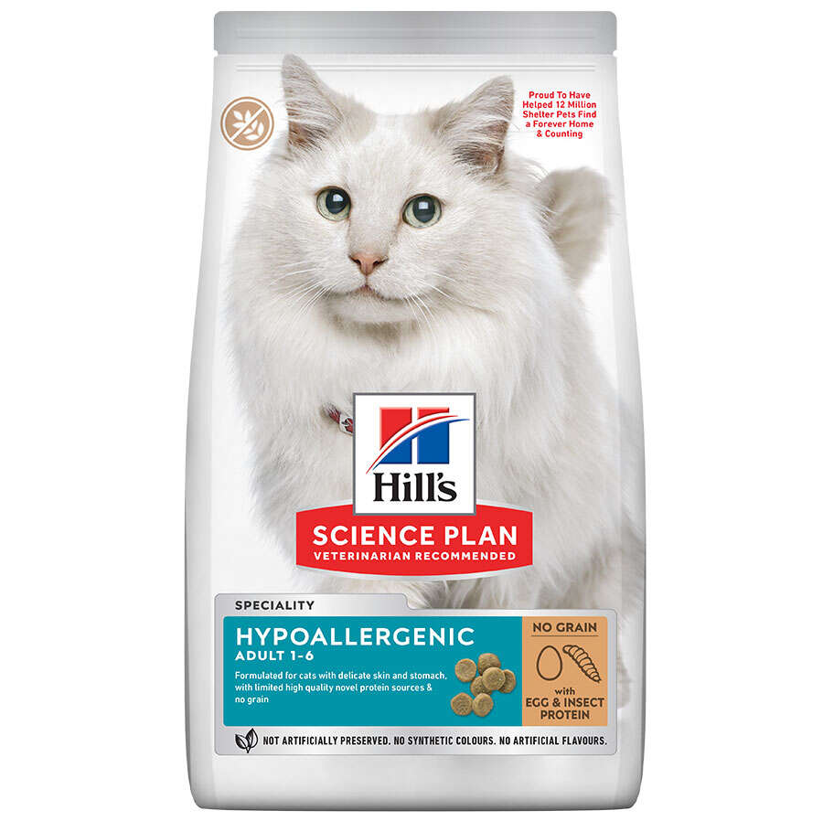 Hill's SCIENCE PLAN Yumurta ve böcek proteini içeren hipoalerjenik tahılsız yetişkin kedi maması, sınırlı yüksek kaliteli yeni protein kaynakları ile formüle edilmiş ve hassas kedilerin ihtiyaçlarını karşılamak için özel olarak hazırlanmış hassas bir tariftir.