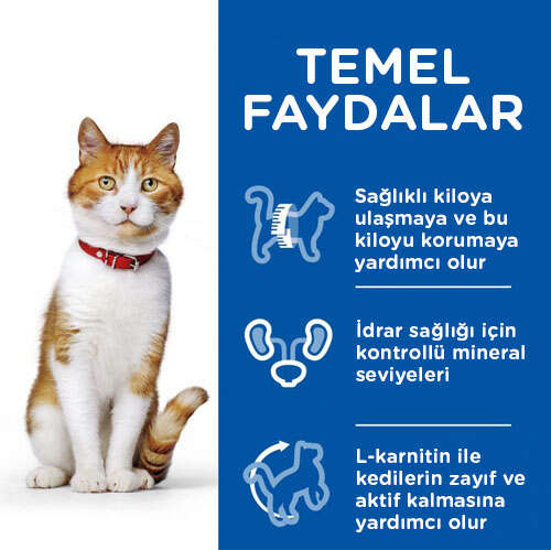 Hills Science Plan Sterilized Cat Young Adult Duck, standart yetişkin maması çeşitlerinden daha az yağ içerirken, kedinize yüksek kaliteli protein ve diğer temel besinleri sağlamaya devam eder. Mineral içeriği aynı zamanda üriner sistemi desteklemek için özel olarak tasarlanmıştır ve idrar yolu sağlığını sağlamaya yardımcı olur. Bu Hills in kuru kedi mamasının dengeli bir tarifi vardır ve günlük diyet olarak uygundur.