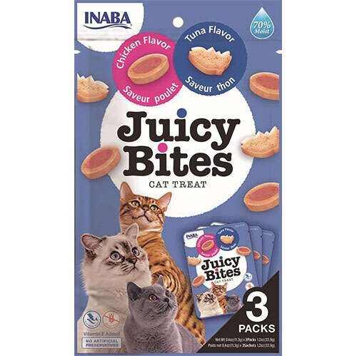 Juicy Bites, doğal aromalar, yeşil çay özü ve E vitamini ile tatlandırılmış, karşı konulmaz derecede Lezzetli, ısırık büyüklüğünde yumuşak ton balığı ve tavuk ödülleridir. Her paket, maksimum tazeliği korumak için üç ayrı ödül paketi içerir ve her ödül paketinde kedileri memnun etmek için iki farklı tatta iki eğlenceli şekil bulunur.