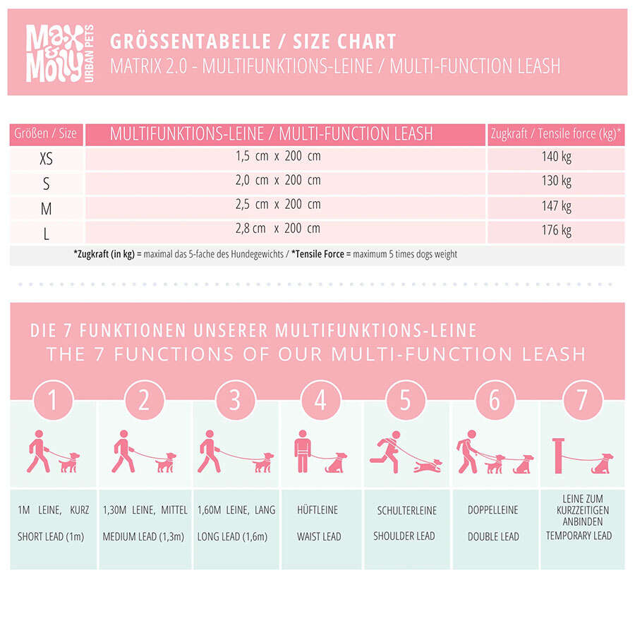 Yeni Max & Molly Matrix 2.0 Çok Fonksiyonlu Köpek Gezdirme Kayışı sağladığı esneklik, konfor ve kalitesi ile eşsizdir. 2 metre uzunluğunda ve 7 farklı şekilde kullanıma uygun esnek tasarım.Kısa/Orta/Uzun boy Kayış, Bel Kemeri, Omuz Kemeri, İkili Tasma ve Bağlama olarak kullanılabilir. Benzersiz 3 katmanlı sandviç yapısı ile hem siz hem küçük dostunuz için maksimum konfor sağlar