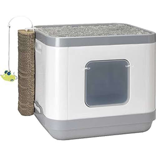 Kediler için, üst kısmını yuva olarak da kullanabilecekleri, tırmalama tahtalı kapalı kedi tuvaleti.