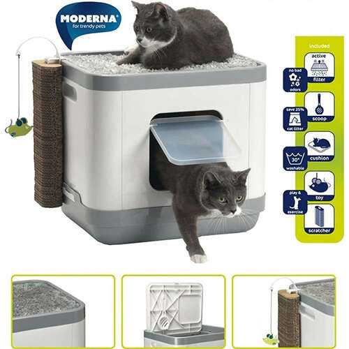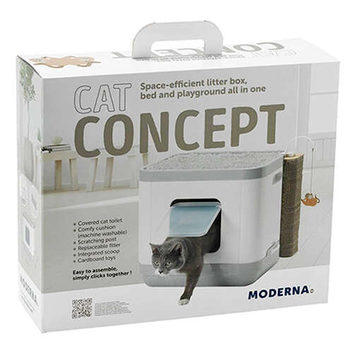 Moderna Cat Concept Kedi Tuvaleti Moderna'nın kedi için çok işlevli bir ürünüdür. Geniş ve verimli tuvalet kabına ek olarak, Cat Concept de güzel bir uyku yeri ve oyun fırsatı sunmaktadır. Katlanır kapıyla kedinizin ihtiyaçlarını karşılamak için kolay giriş ve çıkış yapar ve filtre hoş olmayan kokuları azaltır. Karton oyuncaklar ve mukavva tırmalama ve oyun oynamak için idealdir.