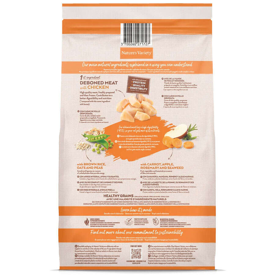 Kemiksiz tavuk eti* (%21), kurutulmuş tavuk proteinleri (%20), Esmer pirinç* (%13), kurutulmuş bezelye* (%12), kurutulmuş hindi proteini (%7), yulaf* (%6), mısır proteini, kümes hayvanı yağı* (%4), pancar küspesi*, hidrolize protein (3%), mineraller, kurutulmuş havuç* (%0,5 = %4 taze havuç), kurutulmuş elma* (%0.3 = %2 taze elma), balık yağı* (%0.3). *Doğal bileşenler.