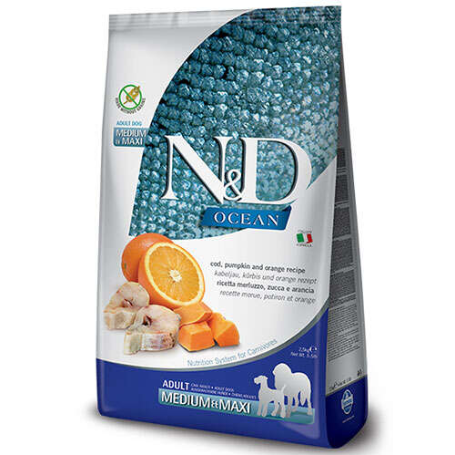 Morina balığı, bal kabağı ve portakal. Yetişkin köpekler için tam mamadır.