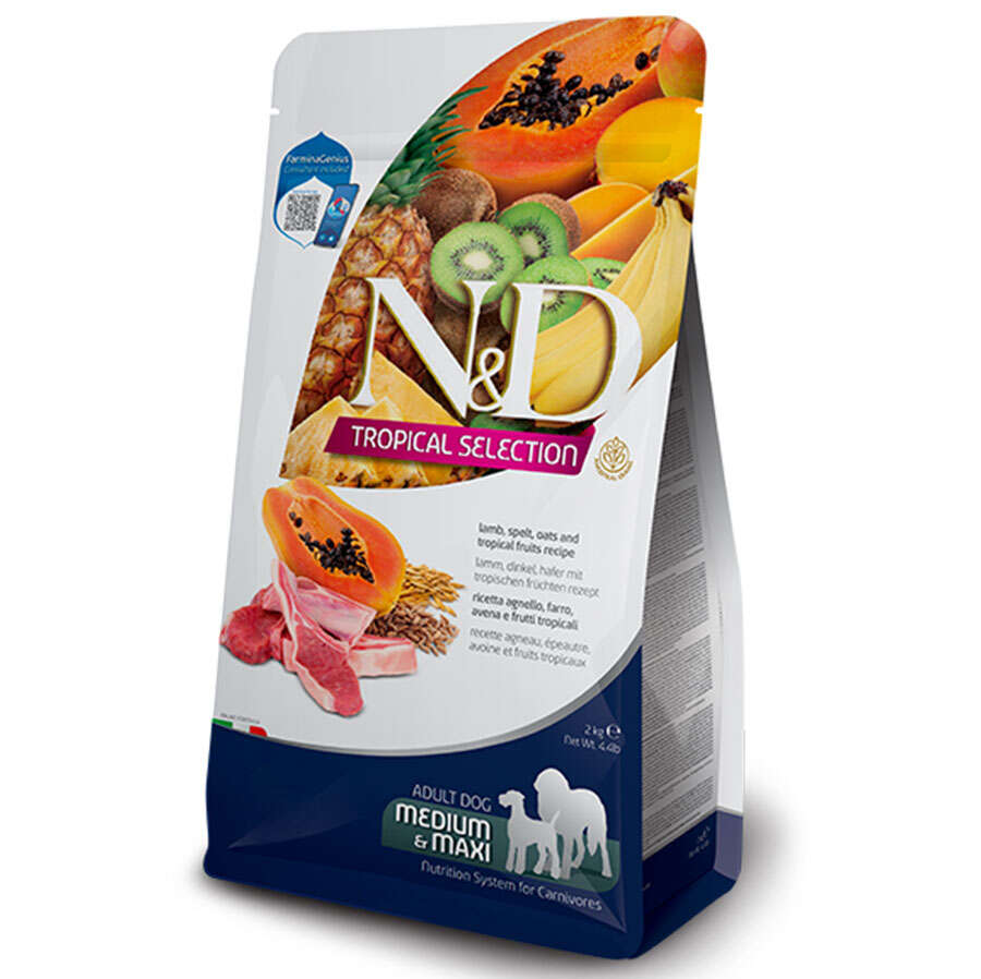 N&D Tropical Selection Kuzu Etli, Kılçıksız Buğday, Yulaf ve Tropik Meyveli Yetişkin Orta ve Maxi Irk Köpek Maması - 10 Kgİçindekiler:Kuzu eti (%20), kurutulmuş kuzu proteini (%20), kılçıksız buğday (%12), yulaf (%12), tavuk yağı, kurutulmuş ringa balığı proteini, kurutulmuş pancar küspesi, balık yağı (ringa balığından), kurutulmuş havuç, yonca unu, inülin, frukto-oligosakkaritler, maya ekstraktı (manno-oligo-sakkarit kaynağı), kurutulmuş muz (%0,5), kurutulmuş kivi (%0,5), kurutulmuş mango (%0,5), kurutulmuş papaya (%0,5), kurutulmuş ananas (0,5) %), kurutulmuş ıspanak, psilyum kabukları ve tohumları, sodyum klorür, kurutulmuş bira mayası, zerdeçal, aloe vera özü, glukozamin, kondroitin sülfat.A Vitamini 10000IU; D3 Vitamini 1000IU; E Vitamini 100mg; C Vitamini 100mg; Niasin 25mg; Kalsiyum D-pantotenat 10mg; B2 Vitamini 5mg; B6 Vitamini 4 mg; B1 Vitamini 3 mg; Biyotin 0.25mg; Folik asit 0.30mg; B12 Vitamini 0.04mg; Kolin klorür 2500 mg; Çinko (Çinko oksit): 86,7 mg; Çinko (Çinko sülfat monohidrat): 43,7 mg; Manganez (Mangan sülfat monohidrat): 48,8 mg; Demir [Demir (II) sülfat monohidrat]: 14,5 mg; Demir [Demir (II) karbonat]: 28,9 mg; Bakır [Bakır (II) sülfat pentahidrat]: 12,8 mg; İyot (Kalsiyum iyodat susuz): 1,56 mg; Selenyum (Sodyum selenit): 0,101 mg; DL-metiyonin, teknik olarak saf 2500 mg.