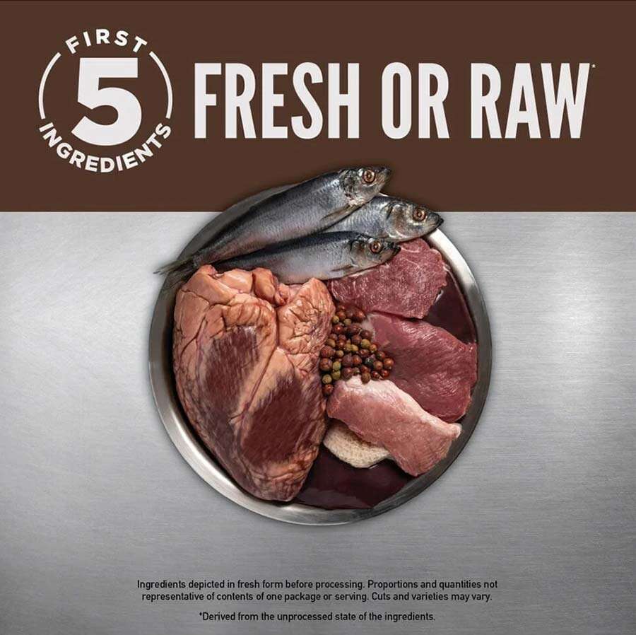 İÇİNDEKİLER : Taze angus sığırı (11%), Taze yaban domuzu eti (4%), taze çayır bizonu eti (4%), taze veya çiğ romney kuzu eti (4%), taze yorkshire domuz eti (4%), taze sığır ciğeri (4%), taze sığır işkembesi (4%), taze bütün sardalya balığı (4%), taze tüm yumurta (4%), taze yaban domuzu ciğeri (4%), kuzu (suyu alınmış, 4%), bütün ringa balığı (suyu alınmış, 4%), bütün ringa balığı (suyu alınmış, 4%), koyun eti (suyu alınmış, 4%), domuz(suyu alınmış, 4%), taze kuzu ciğeri (3,5%), taze kuzu işkembesi (3,5%), bütün sardalya (suyu alınmış, 3%), taze domuz ciğeri (3%), bütün kırmızı mercimek, bütün yeşil mercimek, bütün yeşil bezelye, mercimek lifi, bütün nohut, bütün sarı bezelye, bütün pinto fasulyeleri, sığır yağı (1%), domuz yağı (1%), ringa balığı yağı (1%), sığır kıkırdağı (suyu alınmış, 1%), sığır ciğeri (dondurularak-kurutulmuş), sığır ciğeri (dondurularak-kurutulmuş), kuzu ciğeri (dondurularak-kurutulmuş), kuzu işkembesi (dondurularak-kurutulmuş), taze bütün kabak, taze bütün balkabağı, taze yeşil kabak, taze yabani havuç, taze havuç, taze bütün kırmızı lezzetli elma, taze bütün bartlett armudu, taze kara lahana, taze ıspanak, taze ıspanak, taze şalgam yaprakları, esmer su yosunu, bütün kızılcık, bütün yaban mersini, bütün saskatoon meyveleri, hindiba kökü, zerdeçal kökü, boğa dikeni, dulavratotu kökü, lavanta, hatmi otu kökü, kuşburnu.