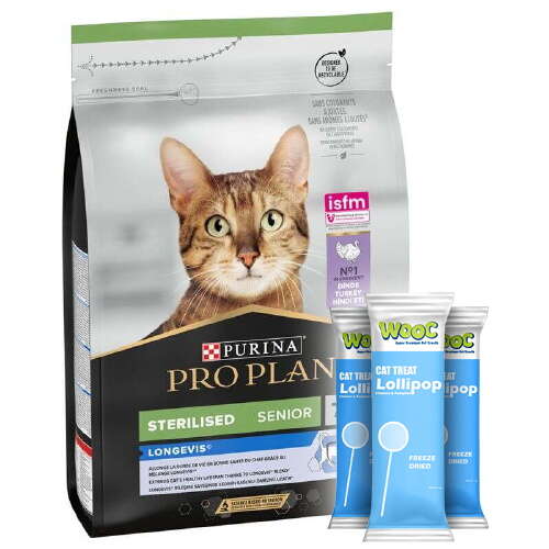 Pro Plan 7+ Kısırlaştırılmış Hindili Yaşlı Kedi Maması 3 Kg + 3 Adet Wooc Kedi Ödülü Lolipop