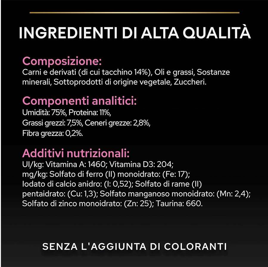 İçindekiler: Et ve hayvansal türevler (%14'ü hindi eti), yağlar, mineraller, bitkisel türevler, çeşitli şekerler
