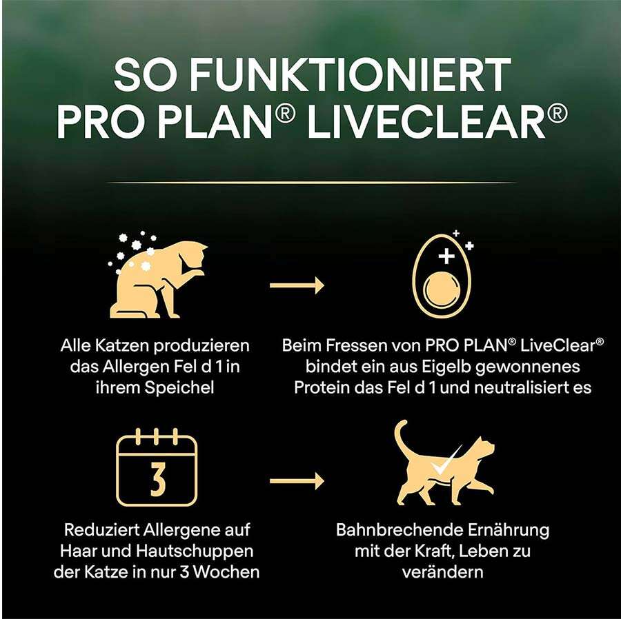 PRO PLAN® LIVECLEAR®, alerjenleri azaltmak için kullanılan diğer yöntemlerin yerine geçmekten ziyade, kedilerin yaşadığı evlerdeki alerjen yükünü azaltmaya yardımcı olmak için ek bir önlemdir ve kediniz için seçkin bir beslenme sağlar.