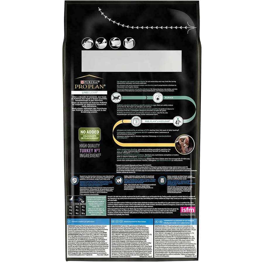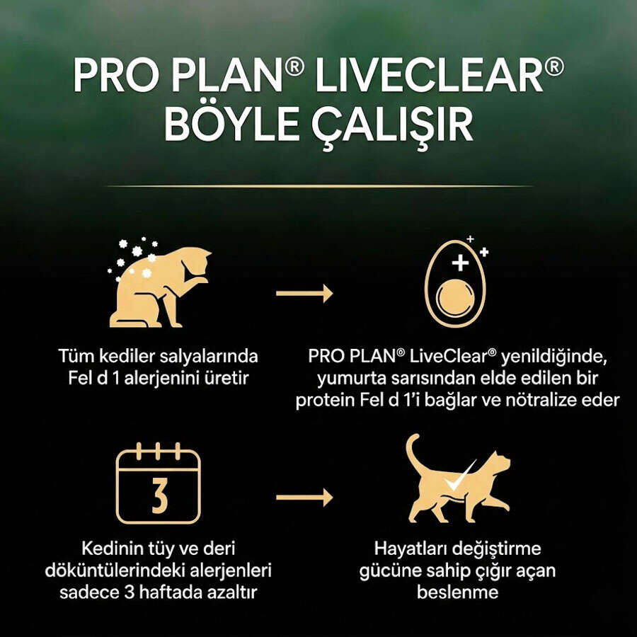 PRO PLAN® LIVECLEAR®, alerjenleri azaltmak için kullanılan diğer yöntemlerin yerine geçmekten ziyade, kedilerin yaşadığı evlerdeki alerjen yükünü azaltmaya yardımcı olmak için ek bir önlemdir ve kediniz için mükemmel beslenme sağlar.
