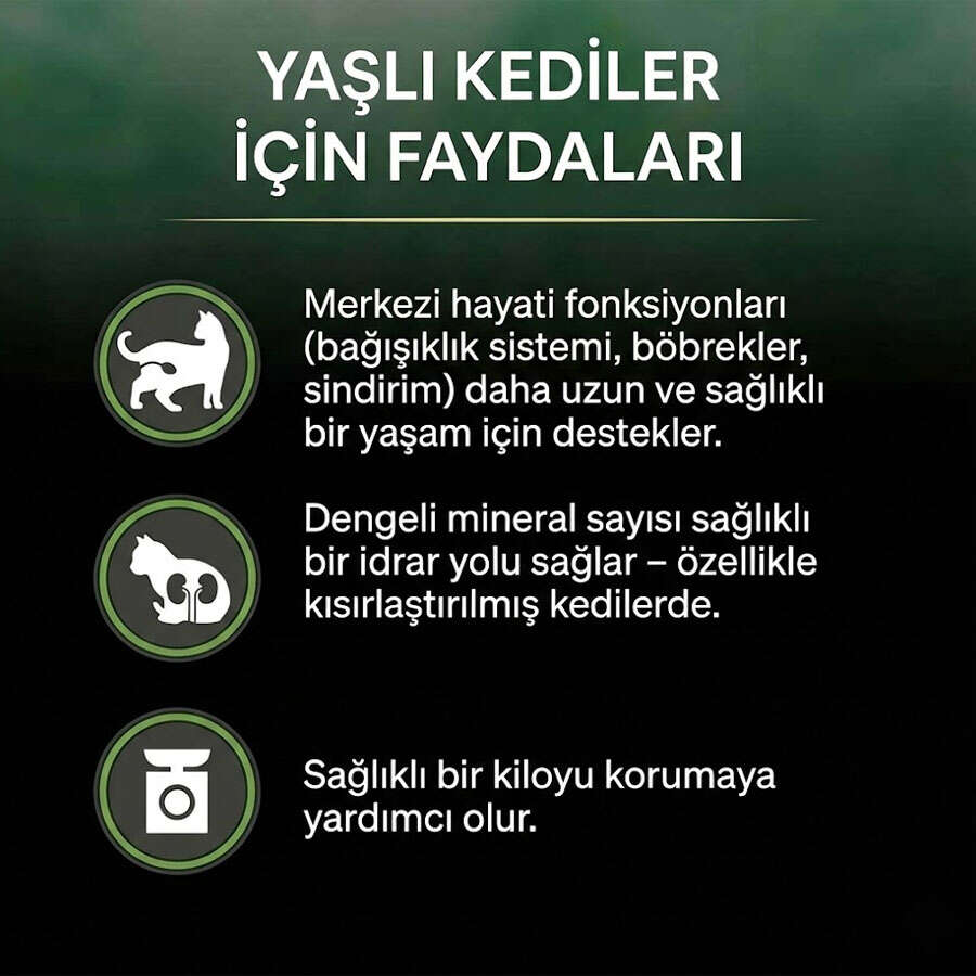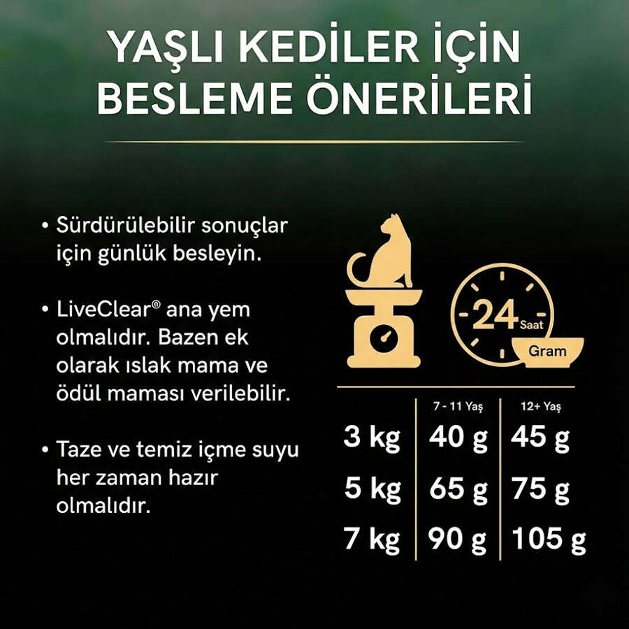PRO PLAN® LIVECLEAR® Sterilised Senior, Zengin Hindi Etli, Prebiyotik, Antioksidan, omega-3 ve omega-6 Yağ asitlerinin özel bir kombinasyonu sayesinde uzun ve sağlıklı bir yaşam için gerekli hayati organları ve fonksiyonları (Bağışıklık Sistemi, böbrekler, sindirim sistemi) destekler. Ayrıca dengeli mineral içeriği sayesinde Kısırlaştırılmış kedilerin üriner sistem sağlığını korurken içeriğindeki yüksek Protein, artırılmış Lif ve düşük karbonhidrat seviyesi ideal vücut ağırlığının korunmasına yardımcı olur.