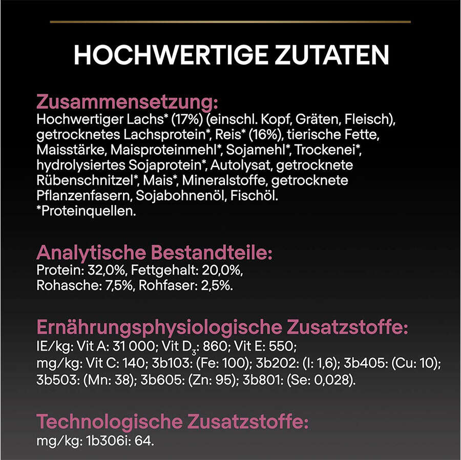 Pro Plan Hassas Yavru Köpekler için Somonlu ve Pirinçli Köpek Maması mide, sindirim, deri ve tüy problemleri olan yavru köpeklerin koruyucu sistemlerinin gelişimini desteklemek ve onların doğru büyüme ve gelişim için ihtiyaç duydukları besinsel ihtiyaçları karşılamak amacıyla PURINA® veteriner hekimleri ve bilim adamları tarafından 2-12 aylık hassas yavru köpekler için özel olarak formüle edilmiş, bir numaralı içeriği gerçek somon etinden gelen 32 oranındaki protein içeriği ile zenginleştirilmiş, yüksek lezzetlilik ve sindirim oranına sahip süper premium köpek mamasıdır. Herhangi bir alerjik reaksiyon oluşum riskini azaltmak için, daha az alerjen olarak bilinen somon eti, mısır ve pirinç protein kaynağı olarak kullanılmaktadır. Alerjik olarak bilinen ve hassasiyet yaratabilen buğday, sığır eti ve süt proteini bu risklerden kaçınmak amacıyla kullanılmamaktadır. Anne sütünde de bulunan beyin ve görme fonksiyonlarının gelişimine katkıda bulunan DHA Docosahexaenoic Asit maddesi içerir.