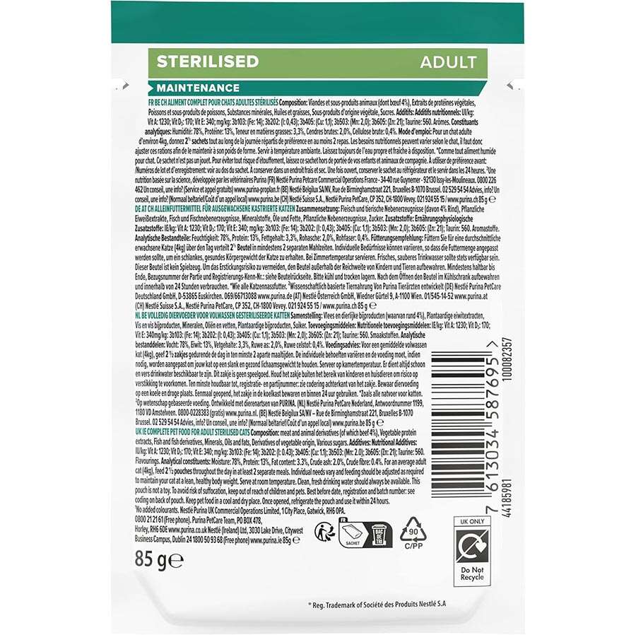 Pro Plan Sterilised, tüm gerekli besinleri sağlayan tam ve dengeli bir kedi mamasıdır. Kısırlaştırılmış kedilerde iyi idrar sağlığının korunmasına yardımcı olmak için formüle edilmiştir.