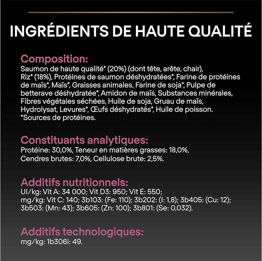 Ana besin değerleri* KuruNem 8.0%Protein 32.0%Yağ 21%Omega-6 Yağ Asitleri 2.3%Omega-3 Yağ Asitleri 1%DHA 0.6%EPA+DHA 0.83% 0.86%Karbonhidrat 30%Ham lif 2.0%Kalsiyum 1.4%Forfor 1%Çinko 22.3 mg/100 gVitamin A 25666 IU/kgVitamin D3 1824 IU/kgVitamin B (total) 330 mg/kgVitamin E 486 mg/kgVitamin C 70 mg/kgMetabolik enerji (ME)1 3.9 kcal/g