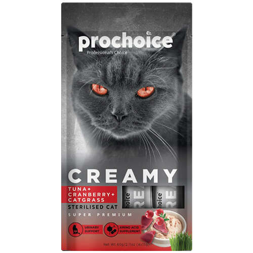 Prochoice creamy ton balığı, kızılcık ve kedi otlu sıvı kedi ödül maması; Kediler için özel olarak üretilmiştir. Sıvı yapıda olup içeriğinde protein, vitamin ve mineral bakımından zengin ton balığı, kızılcık ve kedileri cezbeden kediotu bulunmaktadır. İçeriği sayesinde sağlıklı deri ve parlak tüy oluşumunu desteklemektedir. Kedi ödülü; Paket içerisinde 15gr ağırlığında 4 adet mama bulunmaktadır.